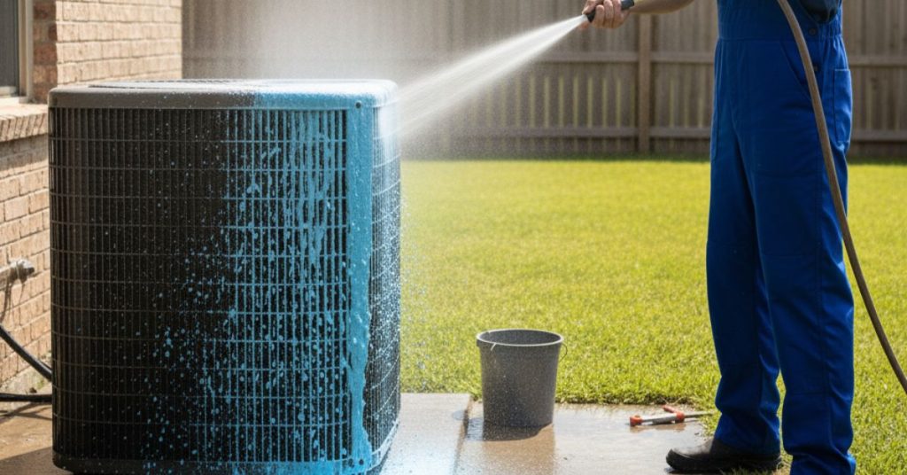 Yes, you can gently clean the coils and remove debris from around the unit using a garden hose and coil cleaner. However, for internal cleaning or electrical issues, it’s best to hire a professional.