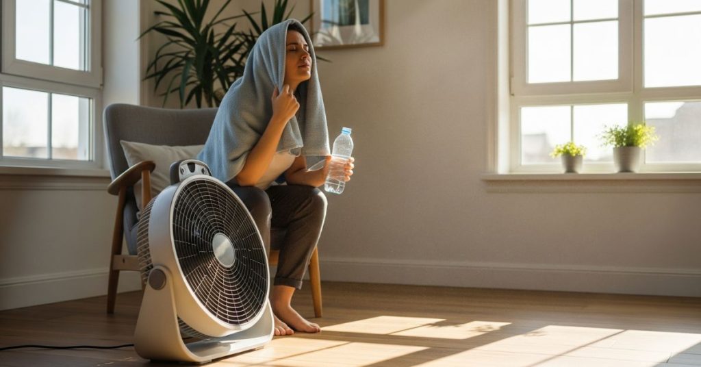 Use fans, close curtains to block sunlight, and open windows at night for airflow. You can also stay hydrated and take cool showers for relief.